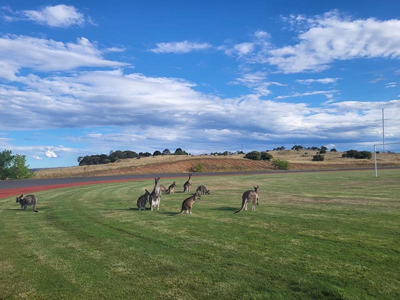 Išeini į lauką - ir jos pasirodo. Kengūros - neagresyvios, aišku, pasisaugoti reikėjo. Aš esu iš tų drąsiųjų, nieko nebijau, tad teko jas ir paglostyti. Jos, kai atsistoja, didesnės už žmogų. Jos man buvo draugiškos ir tikrai nepiktybiškos.