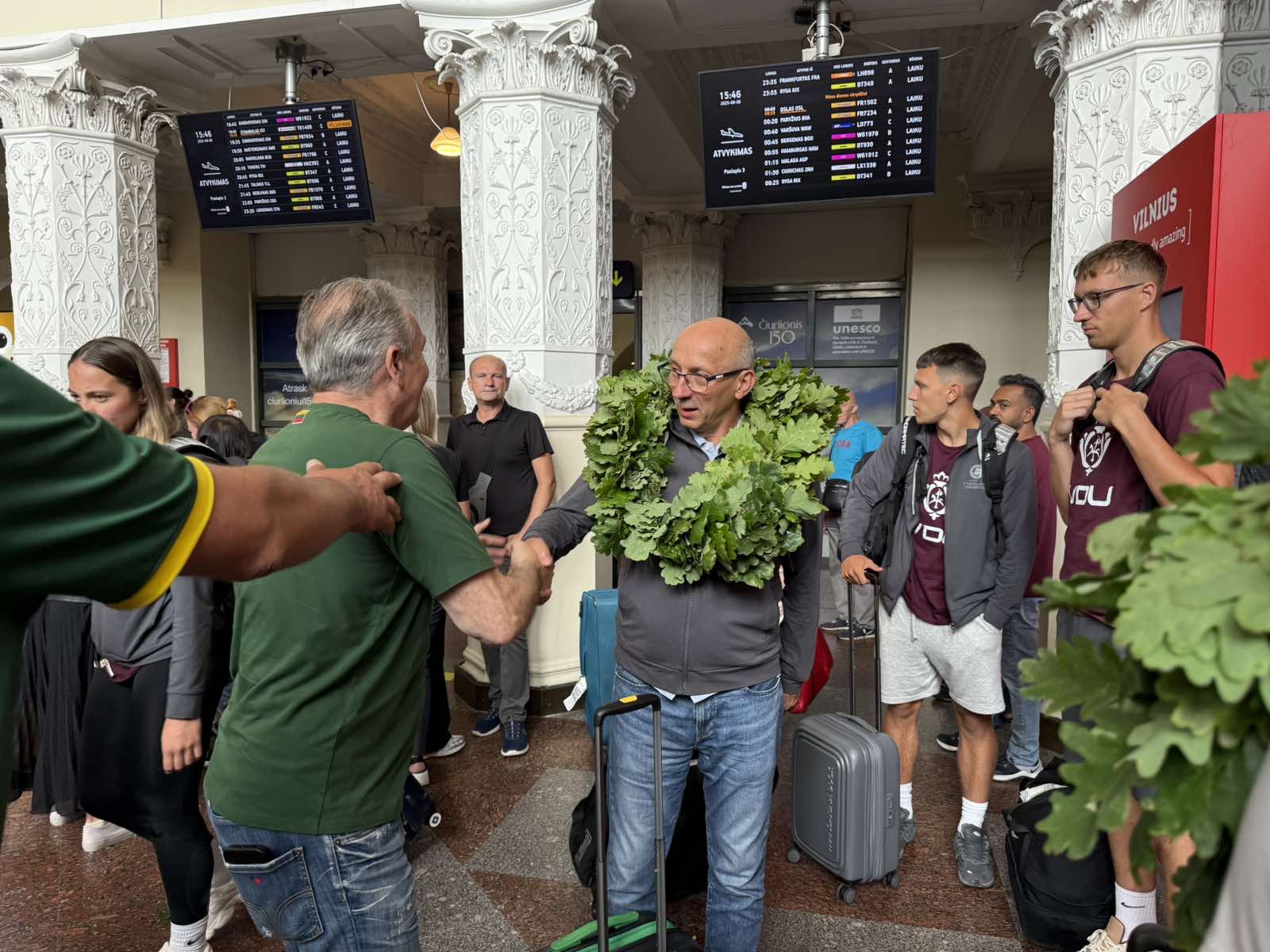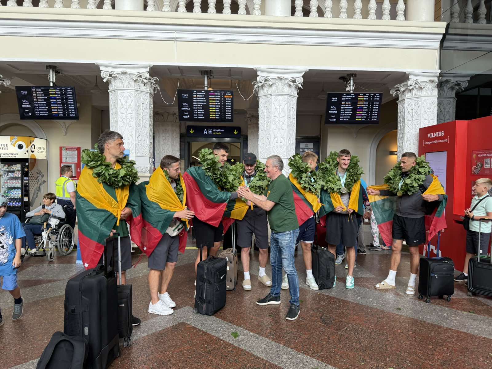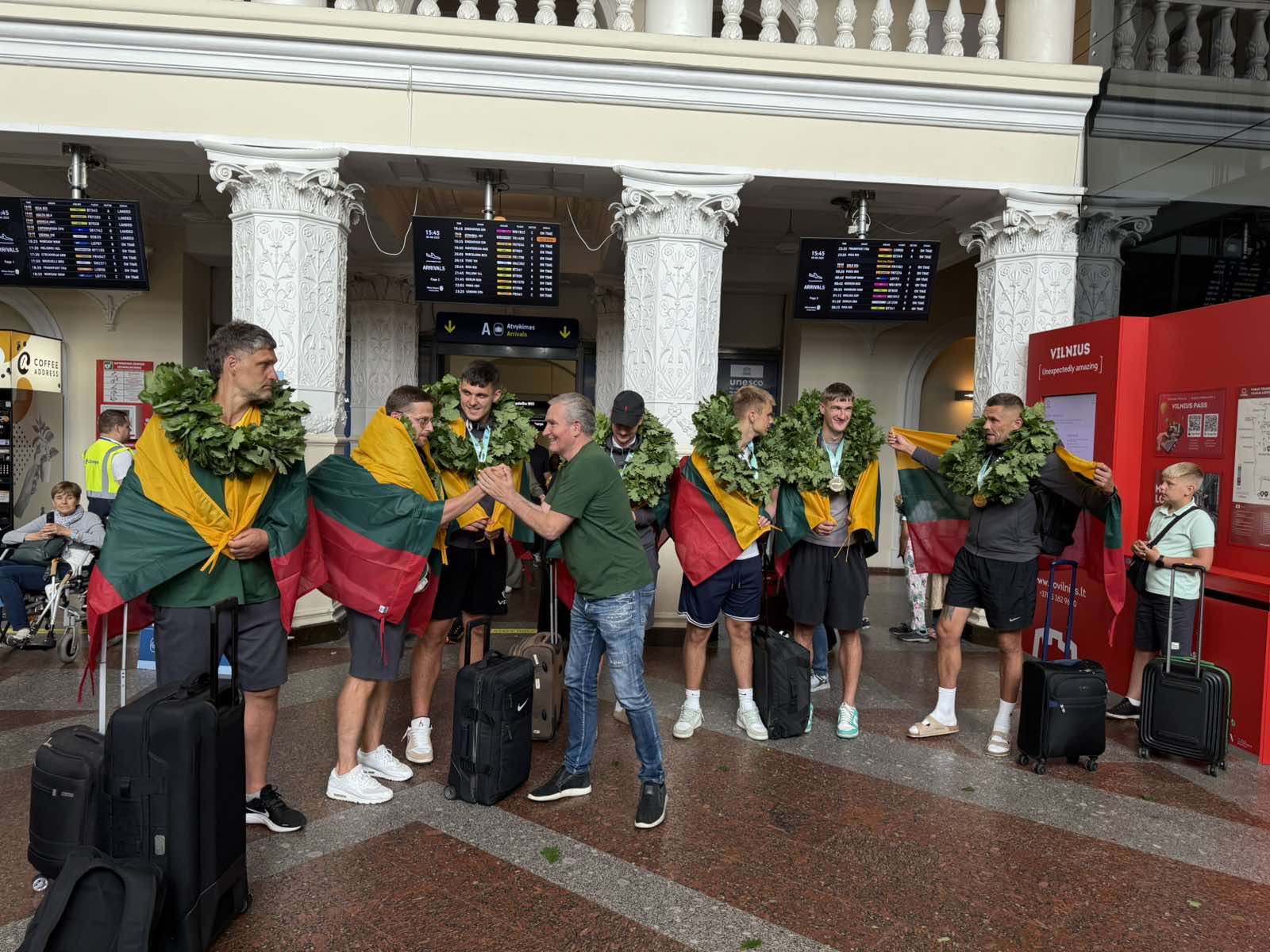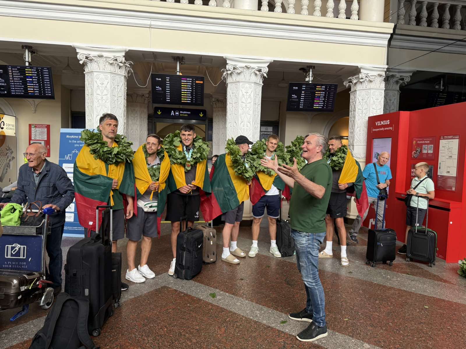 Jūs ir toliau į Lietuvą vežkite medalius, o mes jus visada pasitiksime čempioniškai. Šių tradicijų tikrai nepamiršime", - šypsodamasis sakė Lietuvos studentų krepšinio lygos prezidentas Rimantas Cibauskas, kuris vienas pirmųjų prieš bemaž 20 metų ir pradėjo organizuoti čempionų sutiktuves oro uostuose. Tai tapo gražia tradicija.