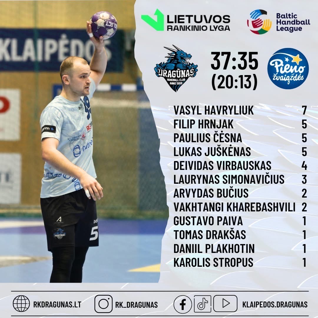 „Dragūnas" laimėjo rungtynes dviejų įvarčių skirtumu – 37:35 (20:13).