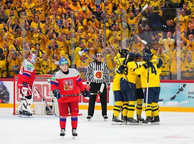 2024 m. pasaulio ledo ritulio čempionės titulą iškovojusi Čekija jo nebegins – Stokholme Švedijos rinktinė 5:2 (3:0, 1:1, 1:1) užtikrintai nugalėjo čekus ir antrus metus iš eilės pateko į pusfinalį.