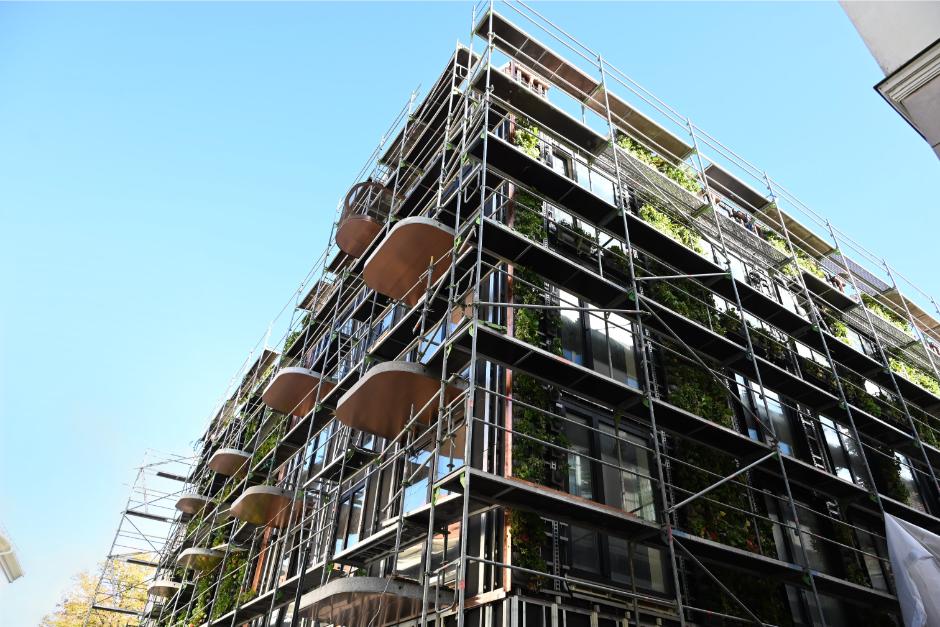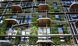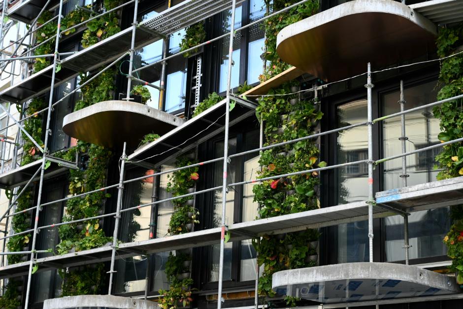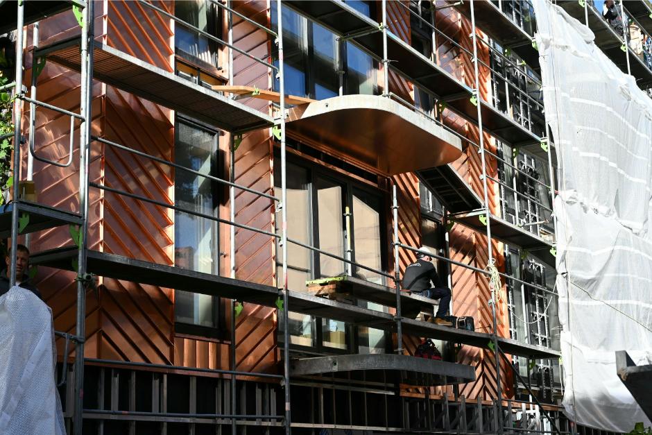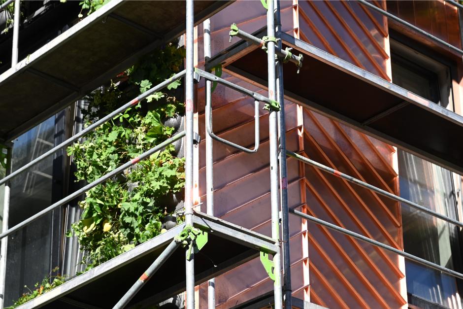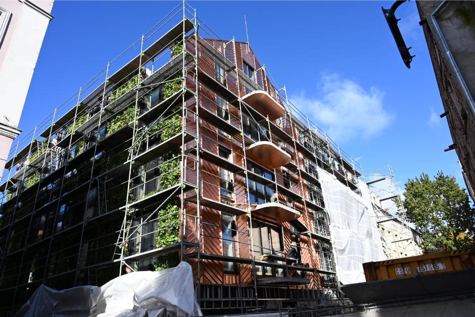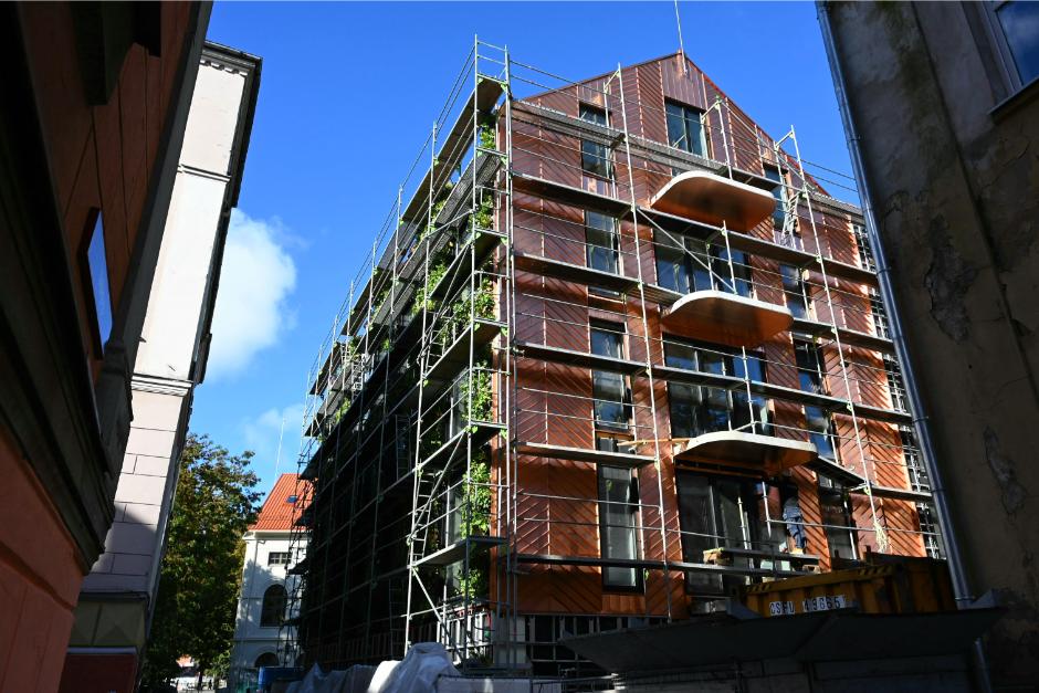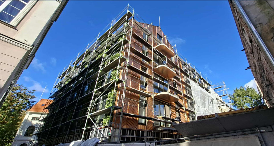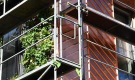 Keturių aukštų su mansarda gyvenamasis namas Žvejų gatvėje išsiskiria fasadu – dalis jo padengtas vario plokštėmis, dalis – apželdinta natūraliais augalais.