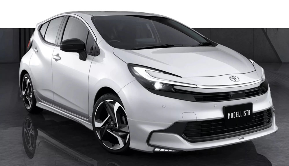 Naujoji „Toyota Aqua 2026“ gavo „Prius“ stiliaus priekį su ryškiu „snukiu“ ir plonais diodiniais žibintais.