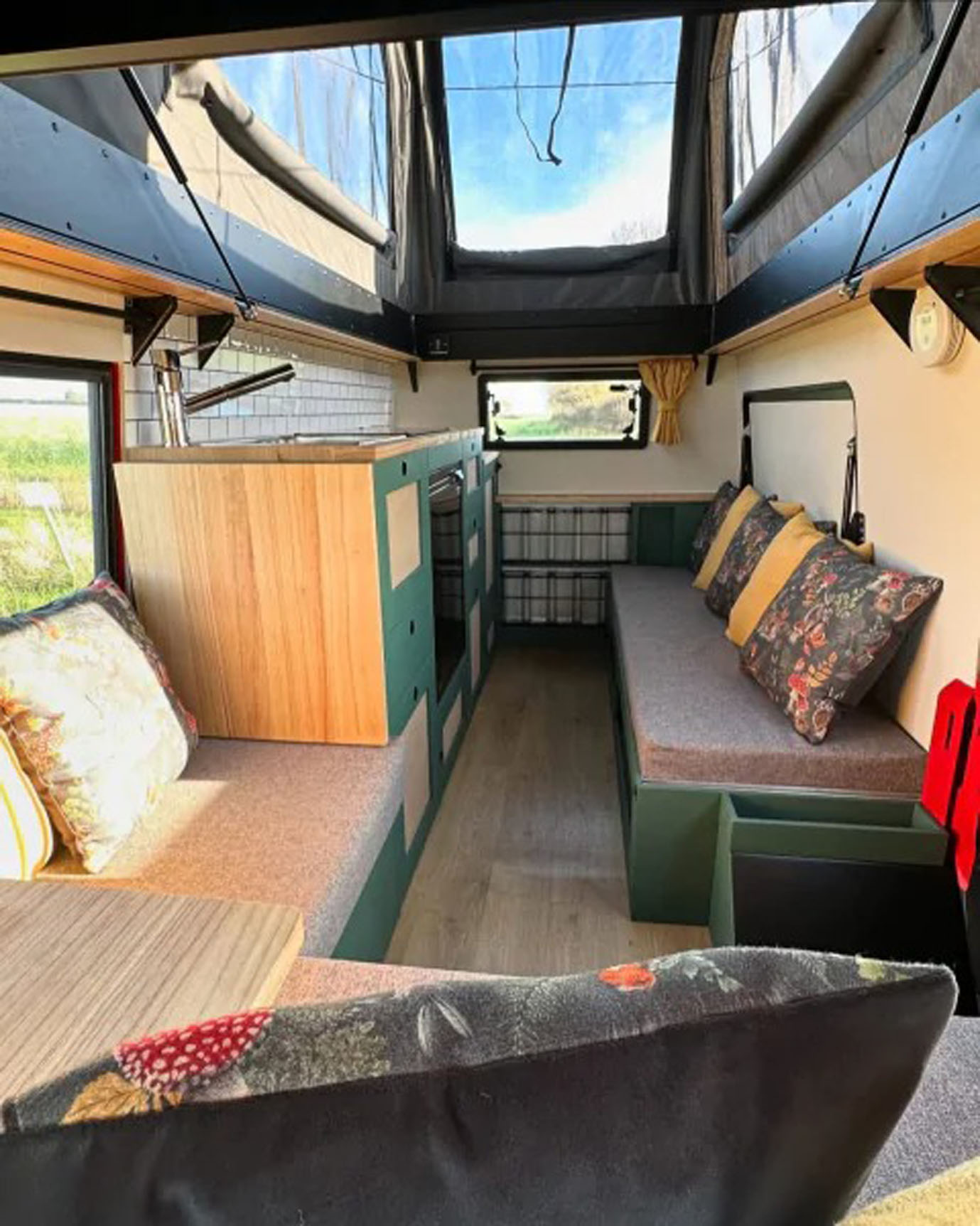 Stogas Pinzgauer dabar pakyla, o antrajame aukšte išsiskleidžia dvigulė lova. Be to, įrengtas nešiojamas lauko dušas.