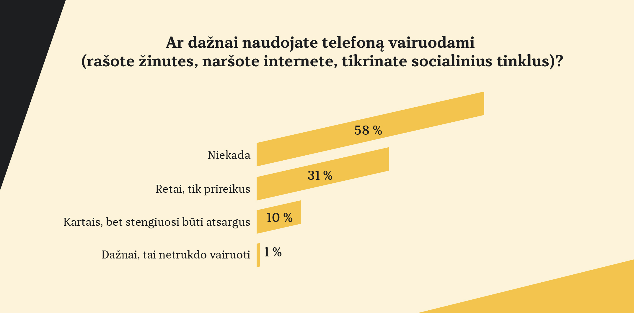 Vos 1 proc. apklaustųjų teigia telefoną vairuodami naudojantys dažnai ir mano, kad tai jiems kelyje netrukdo. Tuo metu visiškai niekada telefono vairuojant nenaudoja tik 58 proc. apklaustųjų.