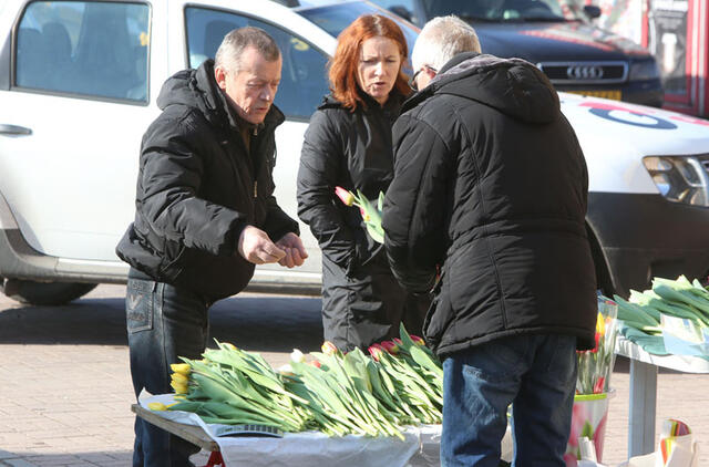 Tradiciškai perka tulpes, salone šiemet tulpės žiedas kainuos 1,50 euro. Gėlių pardavėjas mano, kad už retesnių, gražesnių tulpių žiedą gali tekti pakloti ir 1,70 euro.