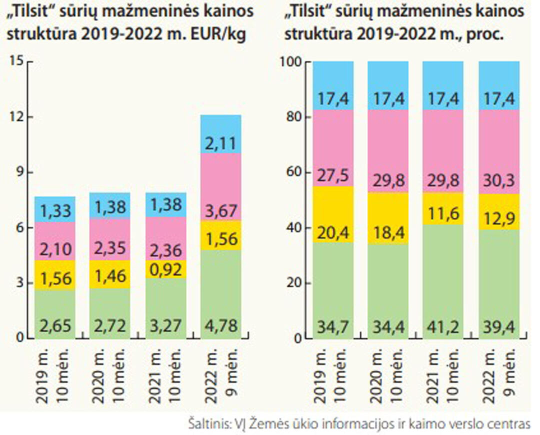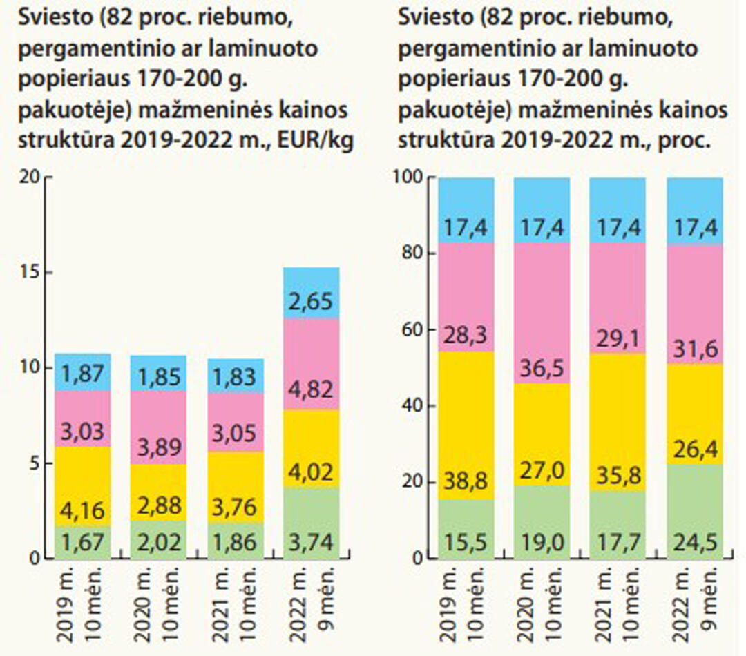 Jau praėjusių metų ketvirtąjį ketvirtį sparčiau pradėjus kilti šių žaliavų kainoms, 2022 m. spalio mėn. natūralaus riebumo pieno supirkimo kainos kilo 47, o grūdų - 45 proc. metiniu tempu", - skelbė Lietuvos bankas, pridurdamas, kad mėsos gaminiai brango beveik 30 proc.