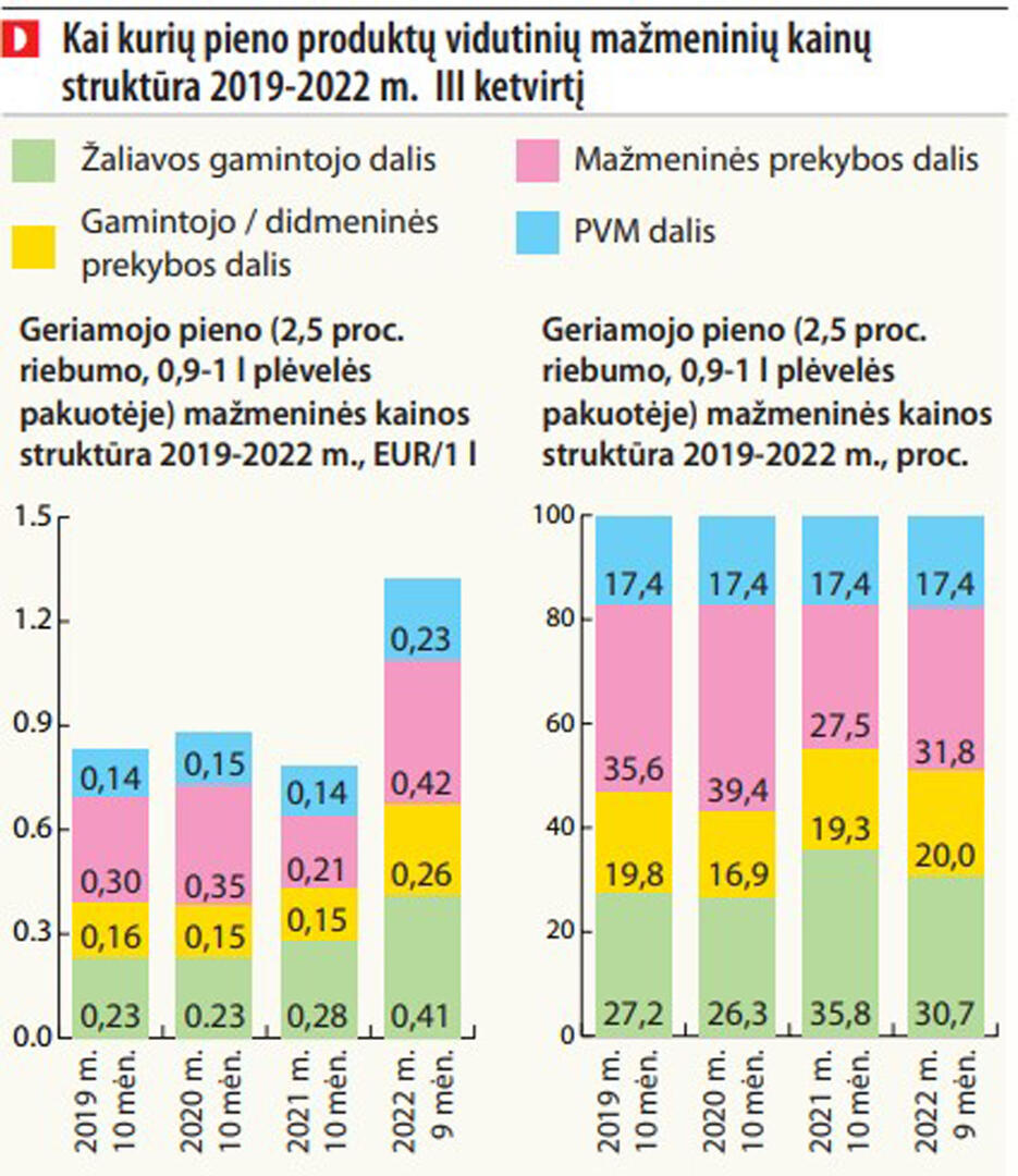„Iš to pieno produktų pernykščio kainų padidėjimo labiausiai išlošė žemdirbiai, nes vasarą pieno supirkimo kaina, lyginant su 2021 m. vasara, buvo maždaug 60 proc. aukštesnė. Tad jei lentynose produktai pabrango 50 proc., o dar pridėkime ir PVM, akivaizdu, kad labiausiai išlošė žemdirbiai", - pareiškė D.Trumpa.