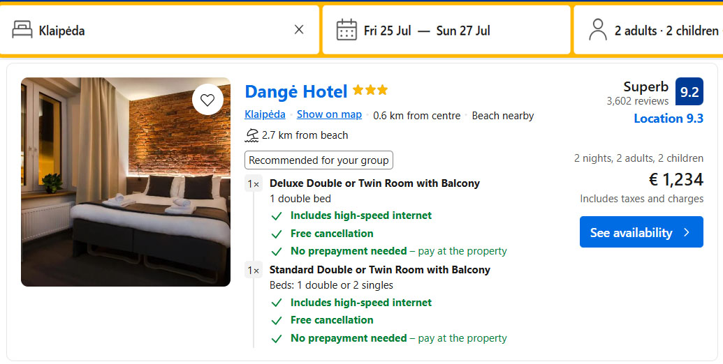 Remiantis vienos iš populiariausių nakvynės rezervacijos sistemos „Booking“ duomenimis, trečiadienį ryte keturių žmonių šeima dar turėjo turėjo šansų šventinį savaitgalį apsistoti Klaipėdos viešbučiuose.