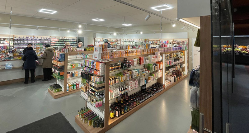 Sodria spalva švyti nauja grindų danga ir lubos, įrengti modernūs LED šviestuvai. Apdailinėmis medžiagomis dekoruotos sienos ir kolonos bei stilizuoti mediniai prekystaliai sukuria jaukią, malonią aplinką.