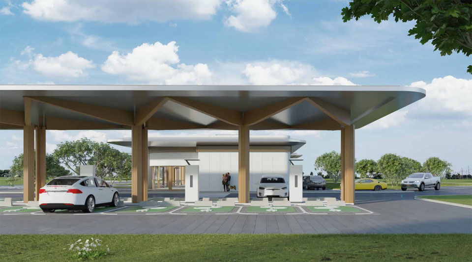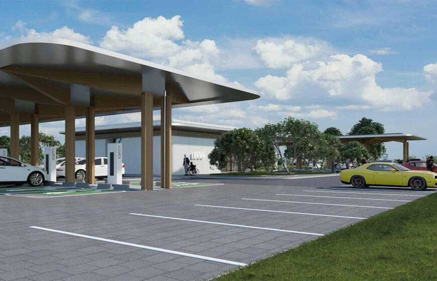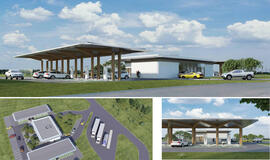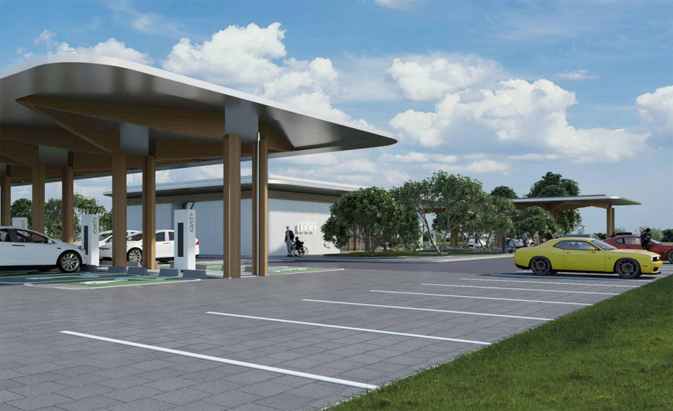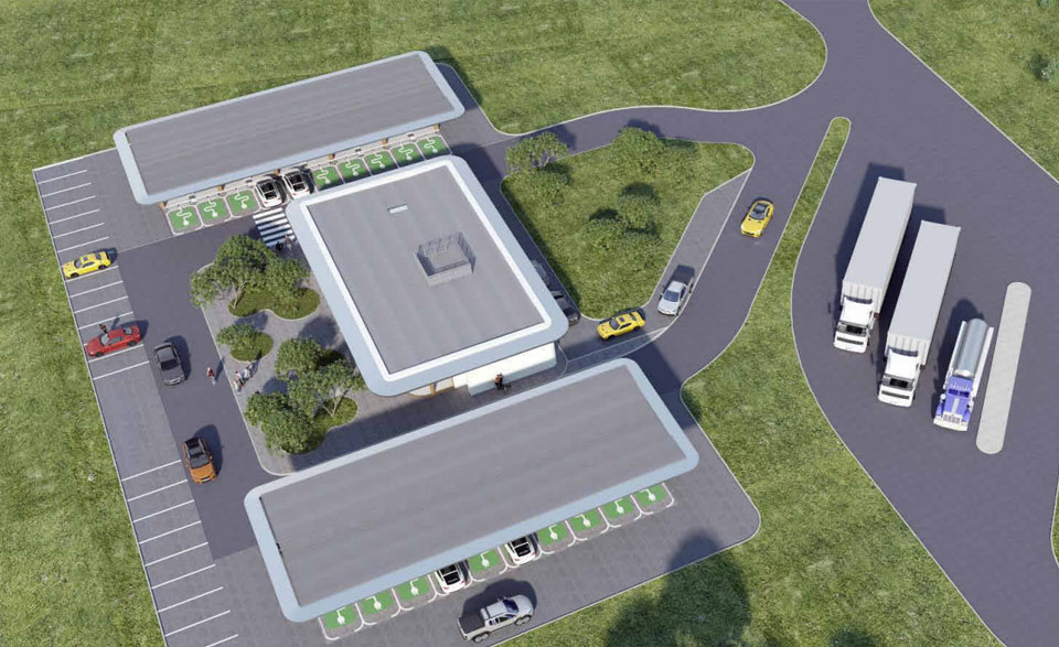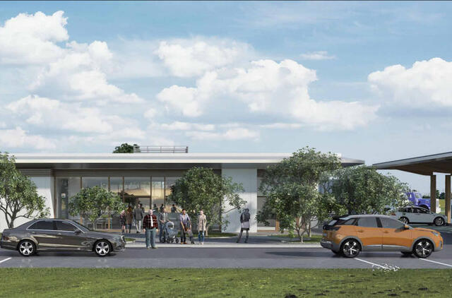 Šioje vietoje įsikurs kavinė „Caffeine“ ir parduotuvė, elektromobilių įkrovos stotelės, sunkvežimių stovėjimo aikštelė.