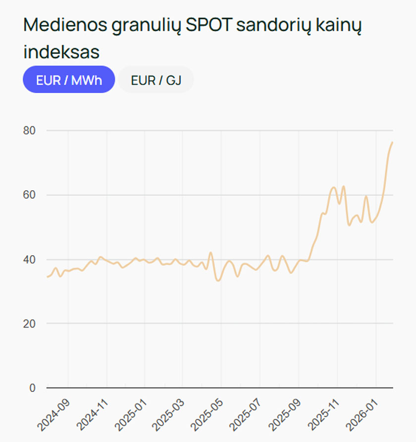 „Baltpool“ duomenimis, neatidėliotinų sandorių (SPOT) rinkoje granulių kaina prieš Kalėdas siekė 51,96, sausio viduryje – 61,18 euro, o sausio 27-ąją – jau 76,5 euro už megavatvalandę.