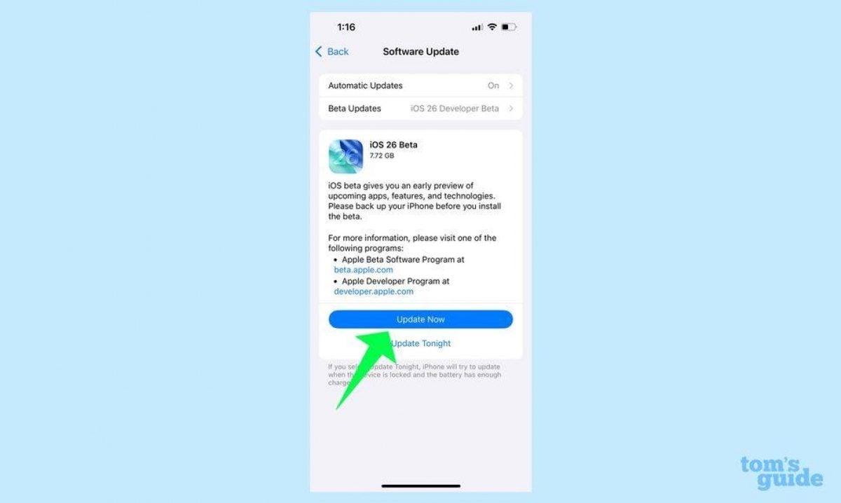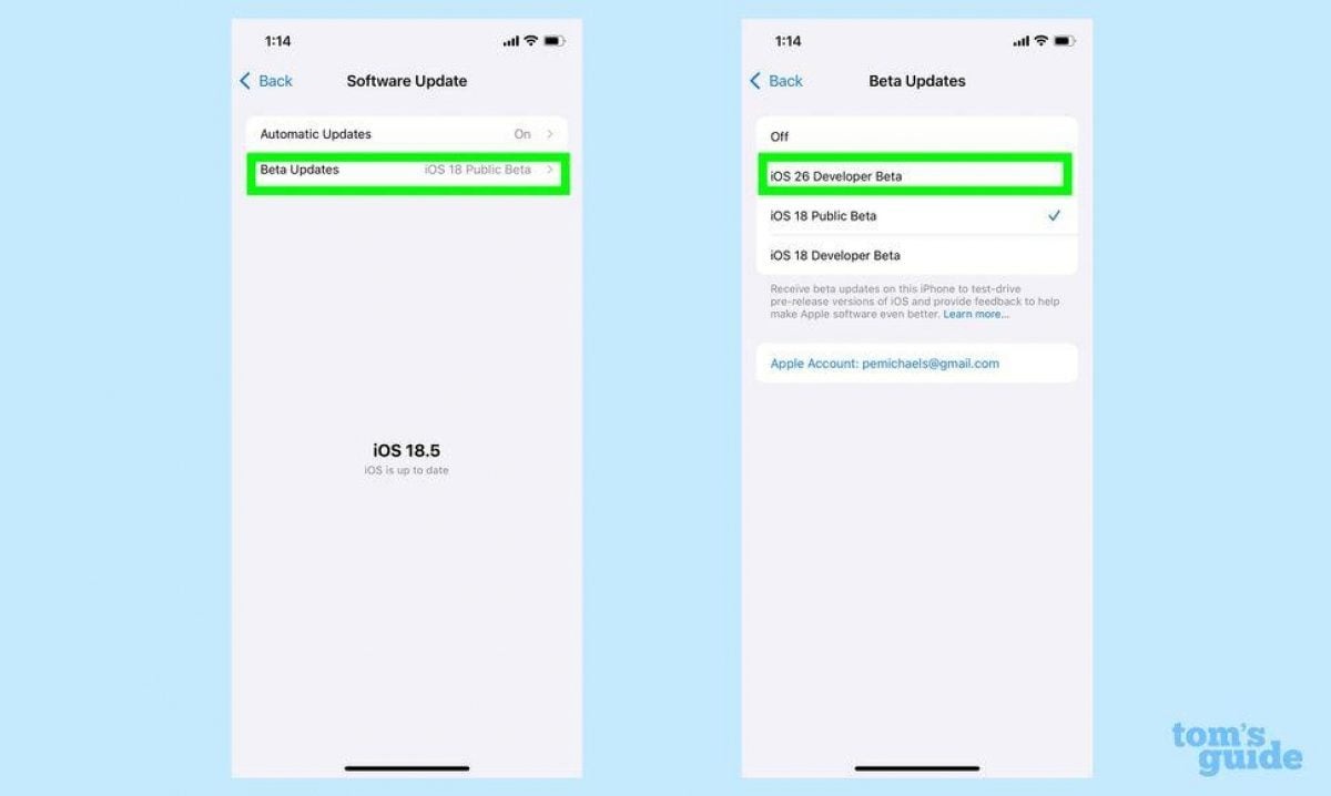 Dabar eikite į „Nustatymai“ → „Pagrindiniai“ → „Programinės įrangos atnaujinimas“ > „Beta atnaujinimai“ ir sąraše pasirinkite „iOS 26 Developer beta“;