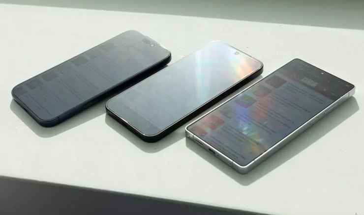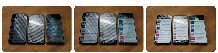 Nors „OnePlus 15“ maksimalaus ryškumo režimu vis dar matomas didelis atspindys, o „iPhone 17 Pro Max“ – net keletas atspindžių, nors ir gana blankių, „S25 Ultra“ atspindžiai visiškai išnyko.