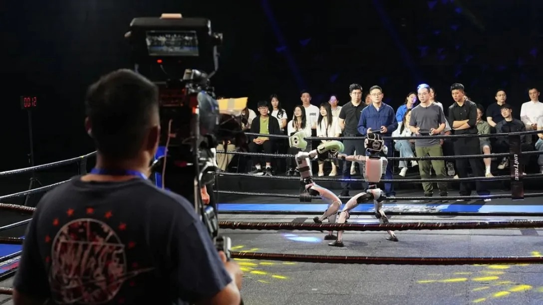 Jame dalyvavo „Unitree“ sukurti G1 robotai: jie smūgiavo kumščiais ir meistriškai išvengė priešininkų atakų.