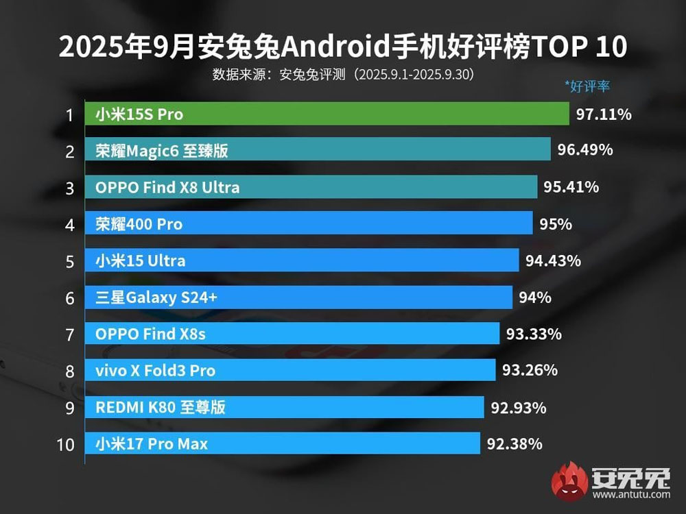 Pirmoji vieta sąraše atiteko „Xiaomi 15S Pro“ – eksperimentiniam kinų flagmanui su savo pačių sukurto procesoriaus. Jo darbu patenkinti 97,11 % vartotojų.