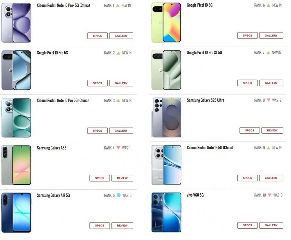 Antroje vietoje yra flagmanas „Google Pixel 10 Pro“. Modelis pasirodė šiek tiek populiaresnis už „Redmi Note 15“ Pro versiją, kuri užėmė 3 vietą. „Samsung Galaxy A56“ ir „Samsung Galaxy A17“ liko vieninteliais „senosios gvardijos“ atstovais penketuke, užimdami atitinkamai ketvirtą ir penktą vietas.