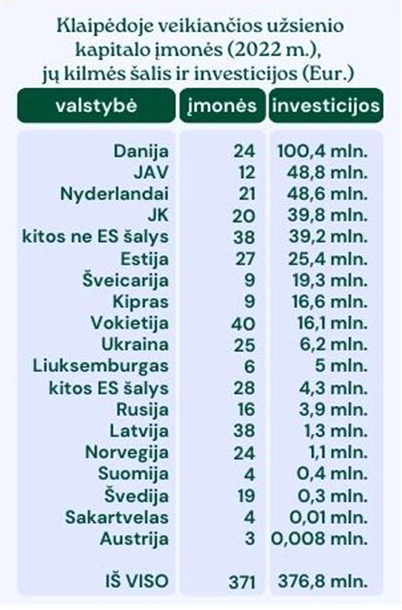 Naujausiais - 2022-ųjų - VDA duomenimis, uostamiestyje daugiausiai buvo investavęs Danijos verslas: Klaipėdoje veikė 24 šios šalies įmonės, o bendra investicijų suma viršijo 100 mln. eurų.