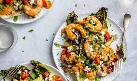 Keptų krevečių gardžiosios salotos su čili ir laimo padažu