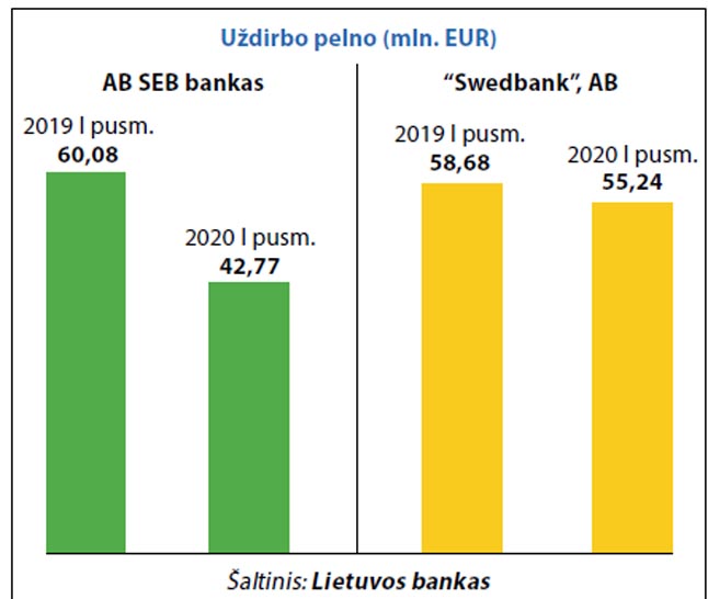 Ypač šiemet suprastėjo SEB veiklos rezultatai. Lyginamuoju laikotarpiu šio banko pelnas sumažėjo beveik 30 procentų - nuo 58,6 milijono iki 41,6 milijono eurų. Per visus 2019 metus šių dviejų bankų pelnas buvo 236,2 milijono eurų.
