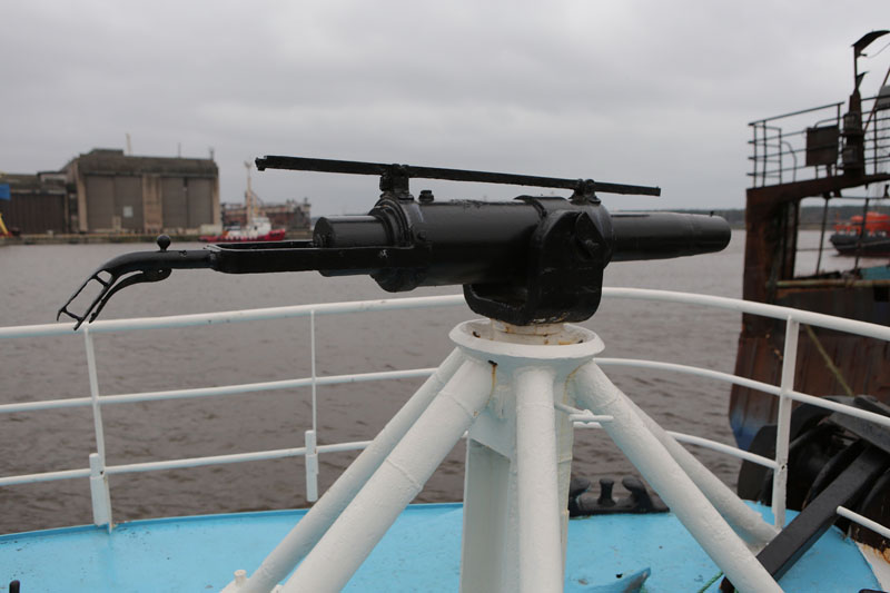 RELIKTAS. Patranka, į kurią įdedama strėlė, paleidžiama į banginius.