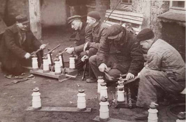 ELEKTRIKAI. 1945-ieji. Elektrikai montuoja vieną skyriklį iš kelių sudaužytų.