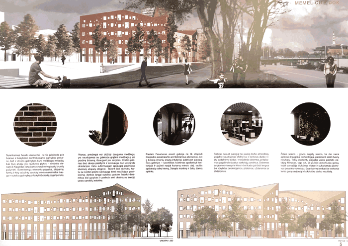 Įgilintos jungtys tarp formuojamų korpusų bei įtrauktos pirmo aukšto galerijos suteikia fasadams erdviškumo bei gylio. Pastato monumentalumą pabrėžia masyvios arkinės kolonos. Visi šie sprendimai suteikia kompleksui išskirtinumo, kuris neabejotinai taps viso „Memelio miesto“ teritorijos vizitine kortele", - tikisi šio projekto autoriai.