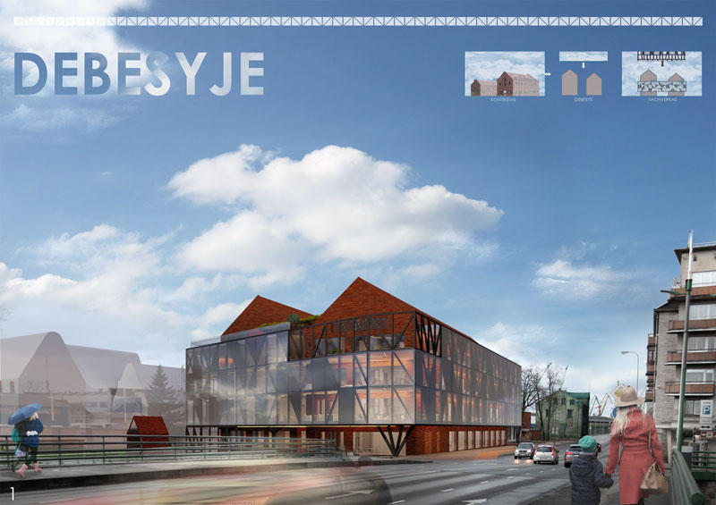 "Klaipėdos miestovaizdis ryškiai išsiskiria iš kitų Lietuvos miestų miesto-uosto charakteriu, būdingu Hanza miestams, kurį formuoja ažūrinės/santvarinės konstrukcijos: fachverkinių pastatų fasadai, uosto kranai, tiltai, laivų statyklos. Šis motyvas inspiruoja fasadų architektūrą.