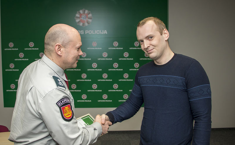 Vyriausiojo policijos komisariato viršininkas už pilietiškumą ir neabejingumą padedant užkirsti kelią nusikalstamumui pareiškė padėką ir įteikė simbolinę dovaną visuomenės atstovui Aleksandrui Jadovui, pranešusiam apie sunkiai girtą vairuotoją ir ją sustabdžiusiam.