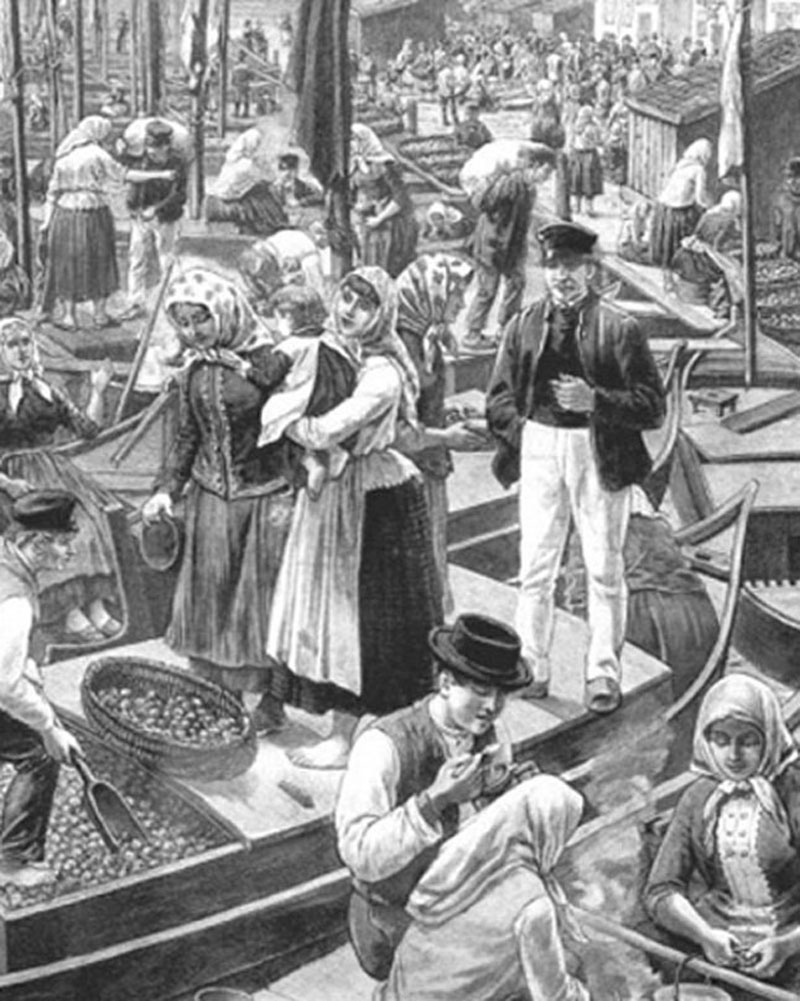 LIETUVININKAI, iš Nemuno deltos kaimų atplaukę parduoti daržoves į Karaliaučių. Apie 1870 m. piešinys, etnografiškai tiksliai vaizduojantis anuometinę aprangą. Tais laikais, kai į Klaipėdą bei Tilžę dar neplaukdavo garlaiviai, deltos daržovininkai į turgų (Rusnės, Karklės, Klaipėdos, Tilžės, Karaliaučiaus) keliaudavo valtimis. Herderio instituto fotoarchyvas