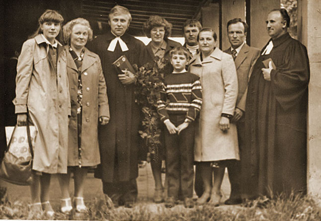 1977 m. konfirmacija. Vyskupas Jonas Viktoras Kalvanas vyresnysis ir diakonas Kurtas Moras.