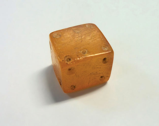 Iš gintaro pagamintas žaidimo kauliukas.
