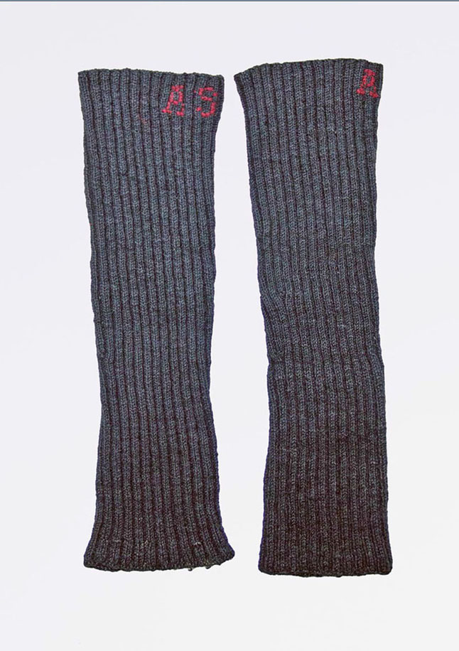 Kojinės be padų - žekstaibės. Sėlenų kaimas. XIX a. pab. Žekstaibės juodos vilnos su raudonai išsiuvinėtais savininkės inicialais AS. Mezgė savininkės Anos Perkamienės (gim. 1881 m.) motina. Žekstaibės nešiotos vasarą vietoj kojinių einant į bažnyčią ar miestelį, kad ilgas sijonas "nepjautų" blauzdų.