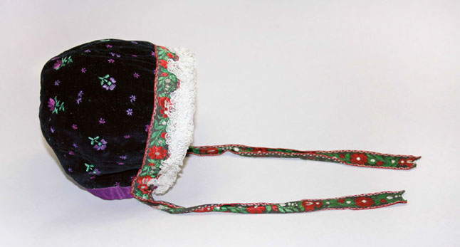 Juodo aksomo kepurėlę, puoštą prabaltais plačiais pinikais, išsiuvinėtą raudonais, žaliais ir žydrais šilkiniais siūlais bei taip pat puoštą juostą mini ir I. Simonaitytė: Nieko idomaus. Visai viršuj guli mažyciai marškinyciai, viena tokia pat mažyte kepuryte, ji juodo aksomo, baltais placiais pinikais apstatyta, raudonais, žaliais ir žydrais šilkais išsiuvineta. Lene nieko neatmena, bet jai lyg kas sakyte sako, kad tai Jonuko krikšto marškinukai ir kepuraite. Cia pat tokio pat juodo aksomo juosta, taip pat šilkais išsiuvineta... Ir ta juosta tegalejo tik Jonukas buti apjuostas, kad ji veže ar neše krikštyti.