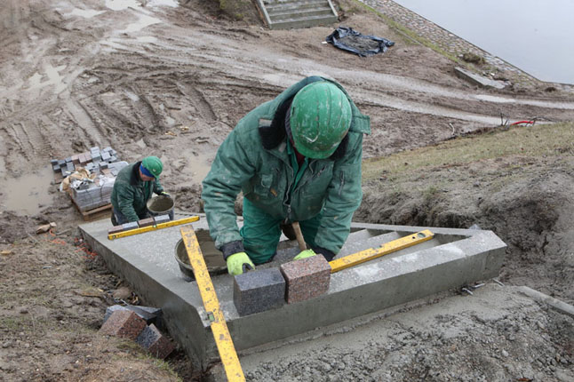 Ant tų plokščių puikuosis spalvotas piešinys. Koks jis bus, statybininkai dar nežino, laukia projektuotojų nurodymų, derina dažų klausimą. Palei vandenį eis akmenų juostos.