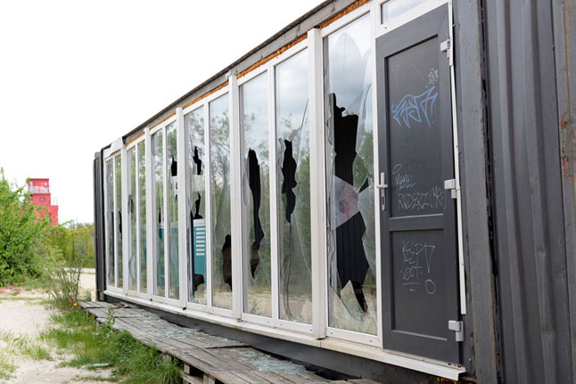 VANDALAI. Prieš keletą savaičių kažkas išdaužė vieno konteinerio stiklus, iki šiol vieta nesutvarkyta. Vitos JUREVIČIENĖS nuotr.