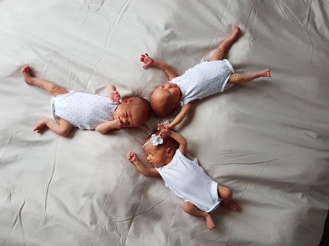 Nepaisant sunkumų nėštumo metu, Cezario pjūvio pagalba Aironas, Jorė ir Augustas gimė sveiki, o jų gimimo laiką skiria tik minutė.